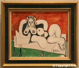 - «La femme allongée» de Picasso ; étendue peu vêtue, alanguie, elle sabote l’image de la « Muter» à tresses blondes qui fait de la pâtisserie dans sa cuisine.