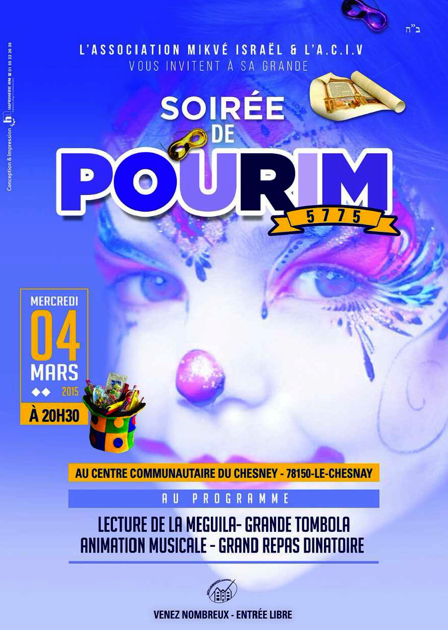 Fête de Pourim au Centre Communautaire du Chesnay le mercredi 4 Mars : venez nombreux pour la lecture de la Meguila et partager un repas.