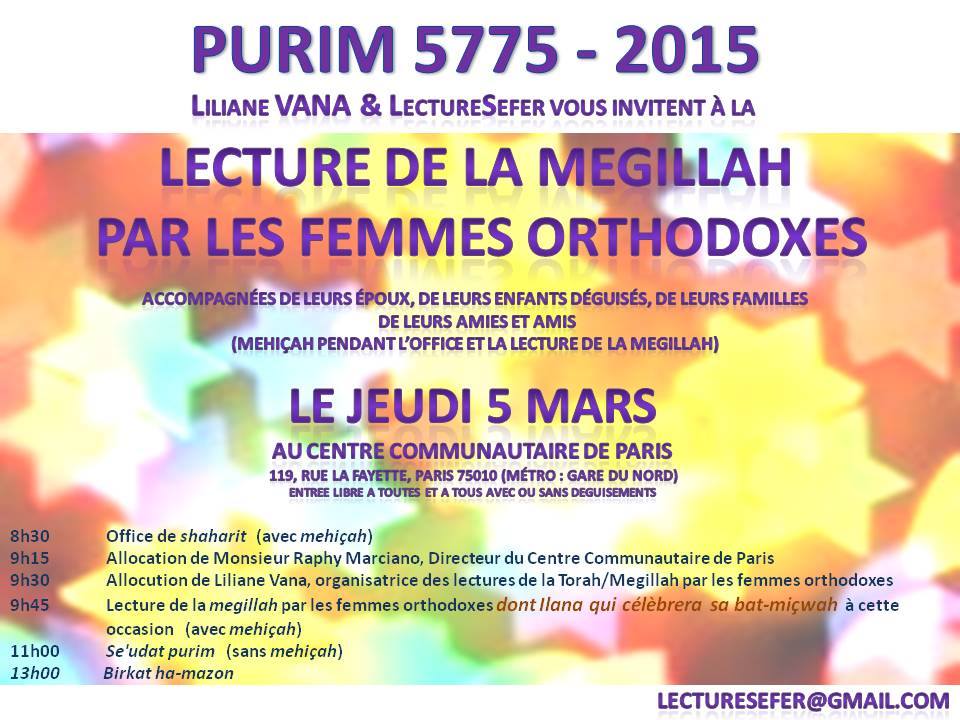 Liliane Vana, érudite orthodoxe et engagée pour la reconnaissance de la place de la femme dans le judaïsme, est à l’origine d’une initiative pour promouvoir la lecture de la Thora et liturgie juive par les femmes dans un cadre conforme à la Halakha. C’est dans le cadre de cette initiative que se déroulait la lecture de la Meguila en ce matin de Pourim. Il s’agit d’ailleurs de la sixième lecture de la Torah et de la Megillah organisée par Liliane Vana et lecture du Sefer dans le cadre de laquelle la bat misva (1) a été célébrée.Dans une salle comble, avec des enfants et des adultes déguisés comme il en est coutume,
