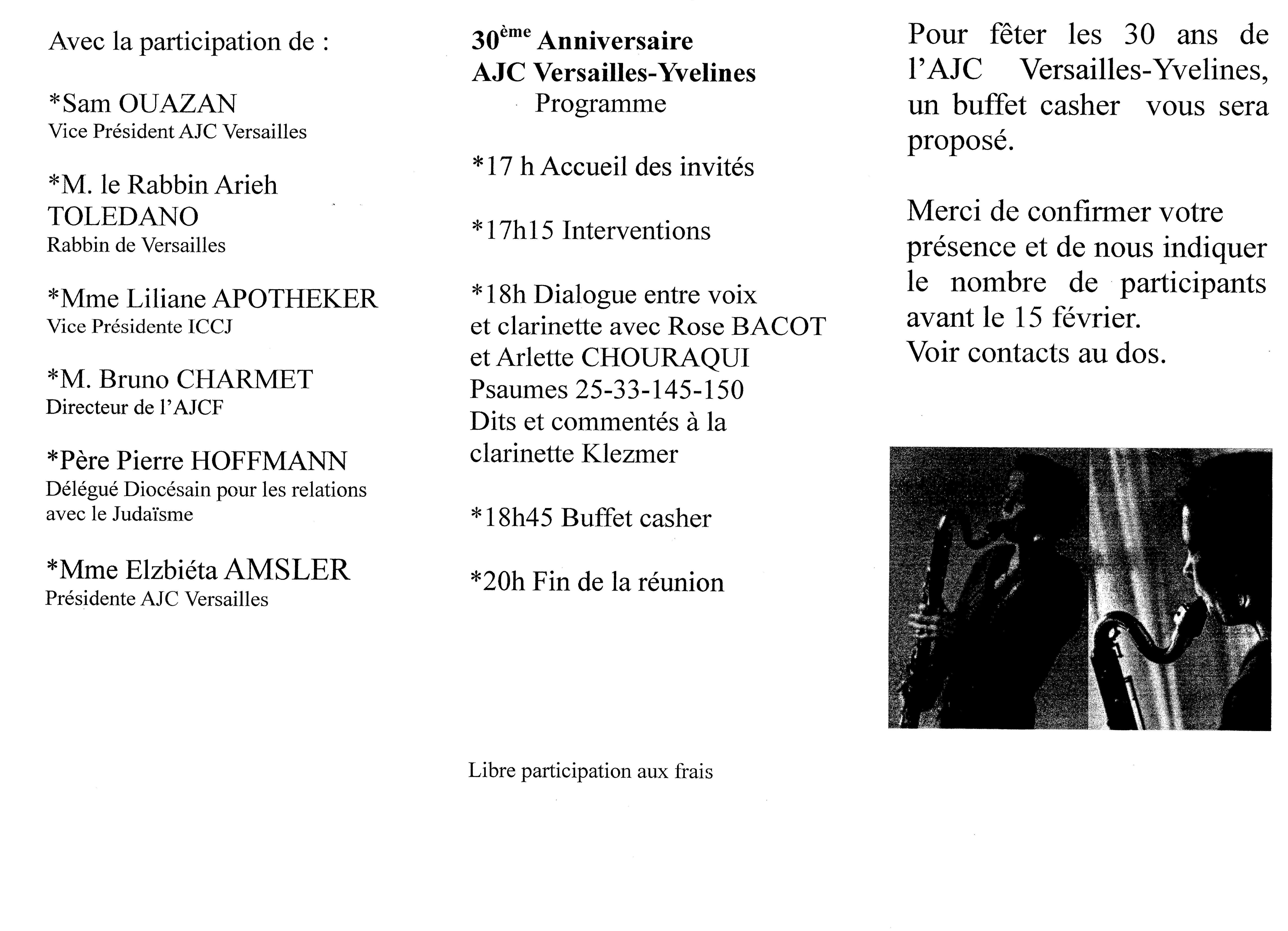 L’Amitié Judéo Chrétienne Versailles-Yvelines vous invite à fêter son 30 ème Anniversaire le dimanche 22 Mars 2015 de 17 à 20 heures à la Synagogue de Versailles.
