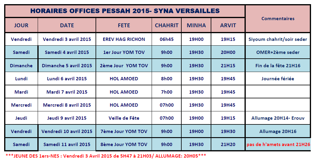 Les horaires de pessah à Versailles