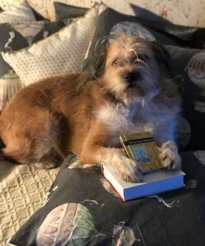 Tiens, voilà Annie : bouquiniste de charme, mère d’une instit. de choc, dont elle rapporte les exploits, bien achalandée en livres neufs déstockés et choisis avec soin : on s’arrête pour échanger à propos de nos protégés : elle son mouton noir, Babar, un petit format, ironiquement nommé et son chat, Justice, un matou au cœur d’amadou ; moi mes chats et ma chienne adorée Lilou : tiens zyeute cette photo où elle me regarde en tenant un livre entre ses pattes ! La minute d’avant elle y mettait la dent et là, d’un seul coup, je ne sais comment elle a fait mais la voilà qui semble poser pour l’enseigne d’une librairie ! Celle d’Annie se nomme : « Le livre enchanté » ; quant à la mienne, si j’en ouvrais une, son titre est tout trouvé : « Au chien qui lit !»