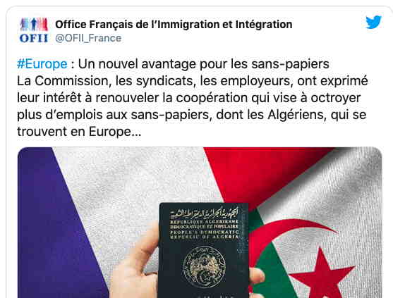 « Les sans-papiers algériens dans les pays européens auront bientôt plus de chances de s’intégrer sur le marché du travail de l’UE. En effet, la commission de l’Union européenne, ainsi que les syndicats, les employeurs, les chambres de commerce et les organisations ont exprimé leur intérêt à renouveler la coopération dans le cadre du partenariat européen pour l’intégration. Cette coopération vise à octroyer plus d’emplois aux sans-papiers, dont les Algériens, qui se trouvent sur le territoire européen. »