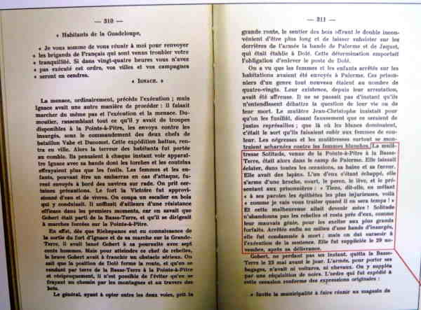 « Ces femmes furent sublimes. Elles fanatisaient les hommes, décuplaient leur courage, montraient autant de bravoure qu’eux, et mourraient, comme eux. […] L’une de ces femmes héroïques, la mulâtresse Solitude, allait être mère ; elle participa à tous les combats au poste de Dolé ; arrêtée ensuite et emprisonnée, elle fut suppliciée dès sa délivrance le 29 novembre 1802. On comprend qu’avec une telle exaltation, le combat du 12 mai dut être héroïque »