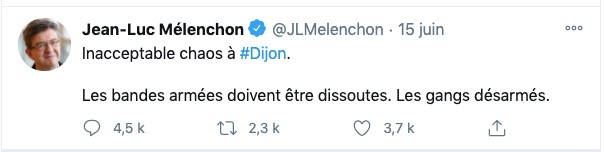 Ce n’est, en tout cas, pas dans cette direction que notre Insoumis national veut faire échouer notre barque : l’État de droit, deux mots qui puent la contrainte et les devoirs. Le.la.les droit.e.s, il est contre. À l’inverse, ce qui lui chante, c’est de copier les revendications de BLM. Il y voit une garantie de succès, sans les inconvénients de la loi et l’ordre. Le désordre, Mélenchon, il kiffe.