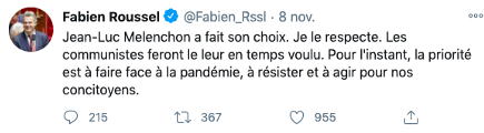 Comme il l’avait fait fuiter dans la presse depuis début octobre (le Figaro), il a toujours été partant pour son troisième tour. Il a attendu, pour l’annoncer, que soit un peu passé le buzz sur l’élection de son homologue Biden aux États-Unis. Cette élection-là n’est encore pas validée, mais puisque tous les médias de la bien-pensance occidentale la célèbrent déjà, c’est tout comme. Pour la candidature de JLM, ce fut chose faite sur TF1, le 8 novembre.