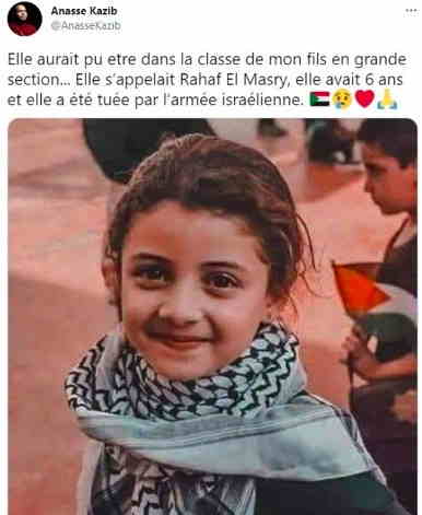 Bah, pour un Anassalphabête, Ramallah, Gaza, c’est tout pareil : c’est de la chair à canon juif. Histoire de se mettre en avant, tout en faisant pleurer Djamila, il a putativement adopté la gamine, lui a inventé un patronyme, l’a rajeunie de quatre ans et l’a fictivement assassinée à Gaza, en accusant l’armée israélienne.