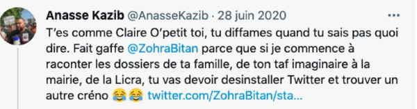 Lorsque Kazib a écrit « Fait (sic) gaffe @Zohra Bitan », il ne s’agissait pas directement d’une menace à l’intégrité physique de la militante laïque : les conseillers juridiques des lobbies islamistes sont bien rodés, ils l’en auraient empêché.