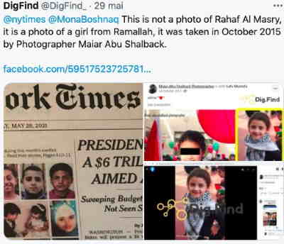 Anasse Kazib-New York Times, même combat. L’équivalent américain du Monde, dont la boussole éditoriale indique en permanence l’antisionisme, avait, lui aussi, sélectionné cette photo parmi celles que les pédo-palestinophiles seraient susceptibles d’apprécier. Pas de chance pour lui, DigFind, une agence spécialisée dans les enquêtes sur Internet et les réseaux sociaux, a levé le lièvre.