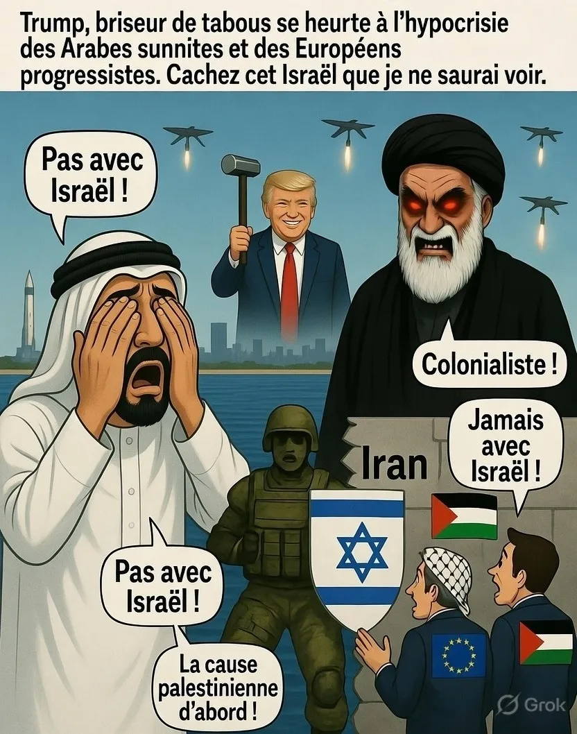 Pas question pour les Arabes sunnites et les Européens progressistes de faire la guerre à l’Iran aux côtés d’Israël. Cachez ce Juif que je ne saurai voir.